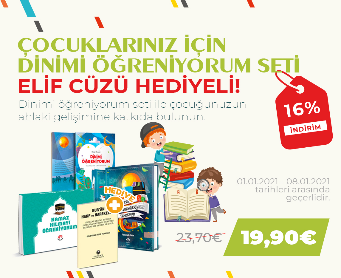 Ebu'l Fâruk Süleyman Hilmi TUNAHAN (K.S.) (SİLİSTREVÎ) Hazretlerinin yepyeni bir tertip ve usûlde yazmış olduğu Kur'ân Harf ve Harekeleri (Kur'ân-ı Kerim'i En Kısa Zamanda Okumayı Öğreten Yepyeni Bir Tertip ve Usul) eserimizle 7'den 70'e her Müslüman'ın kolayca ve çok kısa bir zamanda Kur'ân harflerini ve harekelerini öğrenmesi ve kısa sürede Kur'ân-ı Kerim'i okumaya başlaması mümkün olmaktadır.Dinimi Öğreniyorum Seti ile Çocucuğunuzun Ahlaki Gelişimine Katkıda Bulunun.